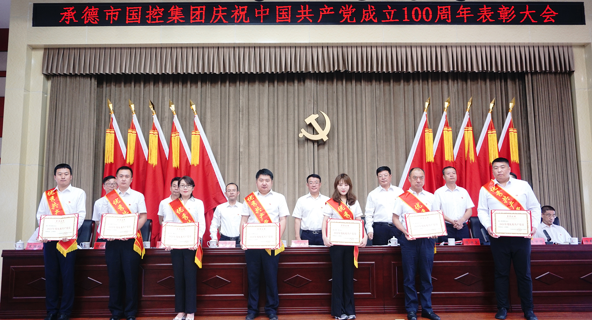 表彰大会气氛隆重热烈,大会在全场起立高唱国歌声中开幕。集团公司党委决定,授予许平凡等7名共产党员“优秀共产党员”称号,授予胡斌伟等3名党务工作者“优秀党务工作者”称号。现场向先进个人颁发了证书,并向参加“庆祝中国共产党成立100周年书画摄影大赛”获奖的人员颁发了荣誉证书。