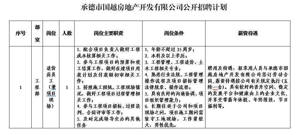 本次拟招聘1个岗位共计1人。具体应聘条件见附件《承德市国越房地产开发有限公司公开招聘计划表》 。
